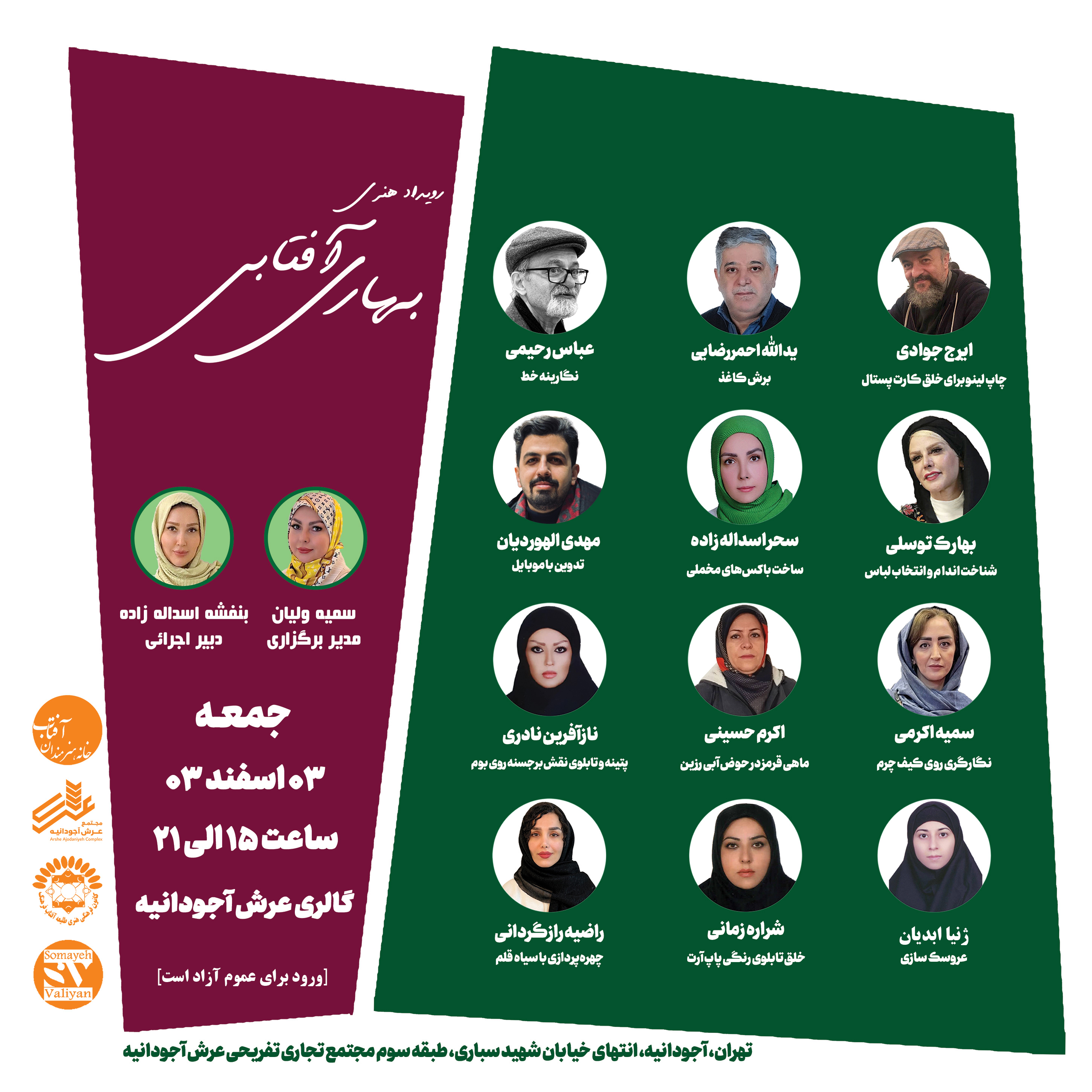 همزمان با تقارن بهار قرآن و بهار طبیعت، رویداد هنری و آموزشی «بهاری آفتابی» روز جمعه مورخ ۳ اسفند ۱۴۰۳ از ساعت ۱۵ تا ۲۱ در گالری بزرگ مجتمع تفریحی، فرهنگی عرش آجودانیه با حضور دکتر فرشاد زاهد، سرپرست معاونت تسهیل تجاری و توسعه کاربردها و اهالی فرهنگ و هنر و جمعی از اعضاء مجمع ملی زنان آینده ساز ایران با حضور جمعی از اساتید و هنرمندان هنرهای تجسمی در ۱۲ رشته هنری برگزار شد.