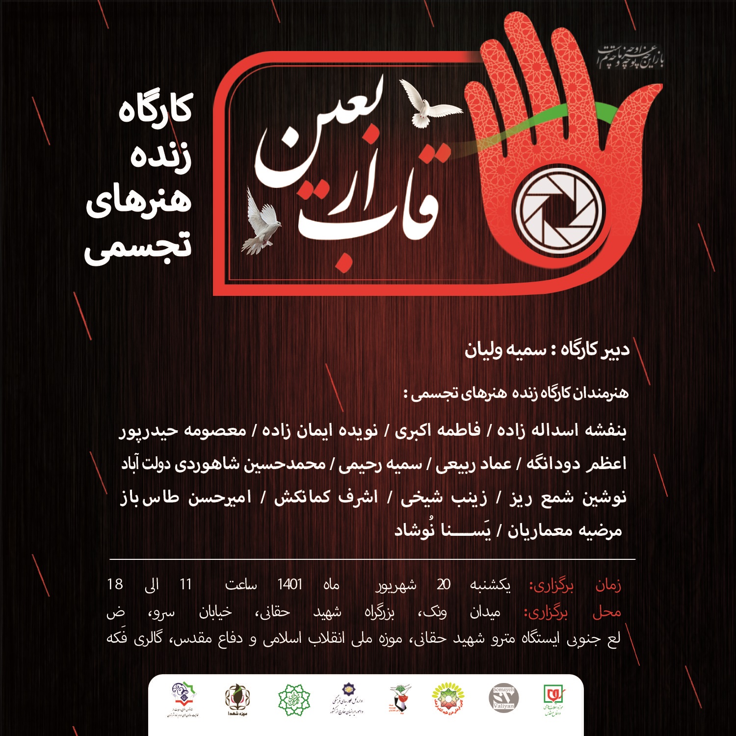 در حاشیه افتتاحیه نمایشگاه کارگاه زنده هنرهای تجسمی با حضور اساتید هنرمند : بنفشه اسداله زاده، فاطمه اکبری، نویده ایمان زاده، معصومه حیدرپور، اعظم دودانگه، عماد ربیعی، سمیه رحیمی، محمد حسین شاهوردی دولت آباد، نوشین شمع ریز، زینب شیخی، اشرف کمانکش، زهرا کیهانی دورباش، احمدرضا حسن شاهی، امیر حسن طاسباز، مرضیه معماریان و یَســــنا نُوشاد در رشته های نقاشی، خوشنویسی، نقاشیخط، خوشنویسی، سیاه قلم و تذهیب با موضوع اربعین حسینی اجرا می گردد.